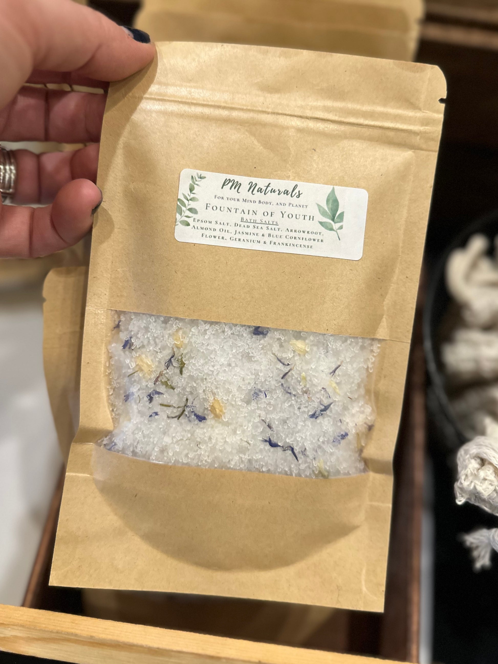 Ingredients: Epsom Salt, Dead Sea Salt, Heather, Arrowroot, Almond Oil, essential oils.